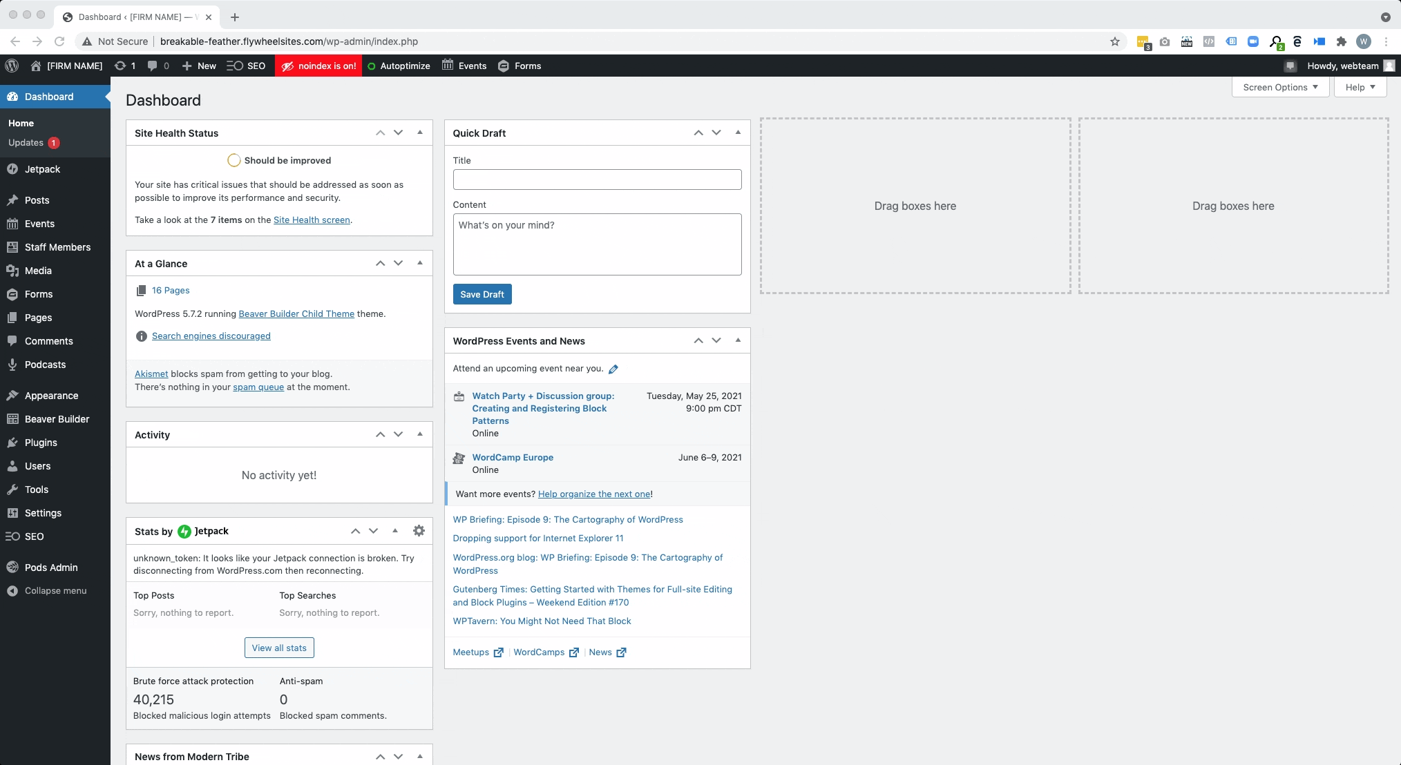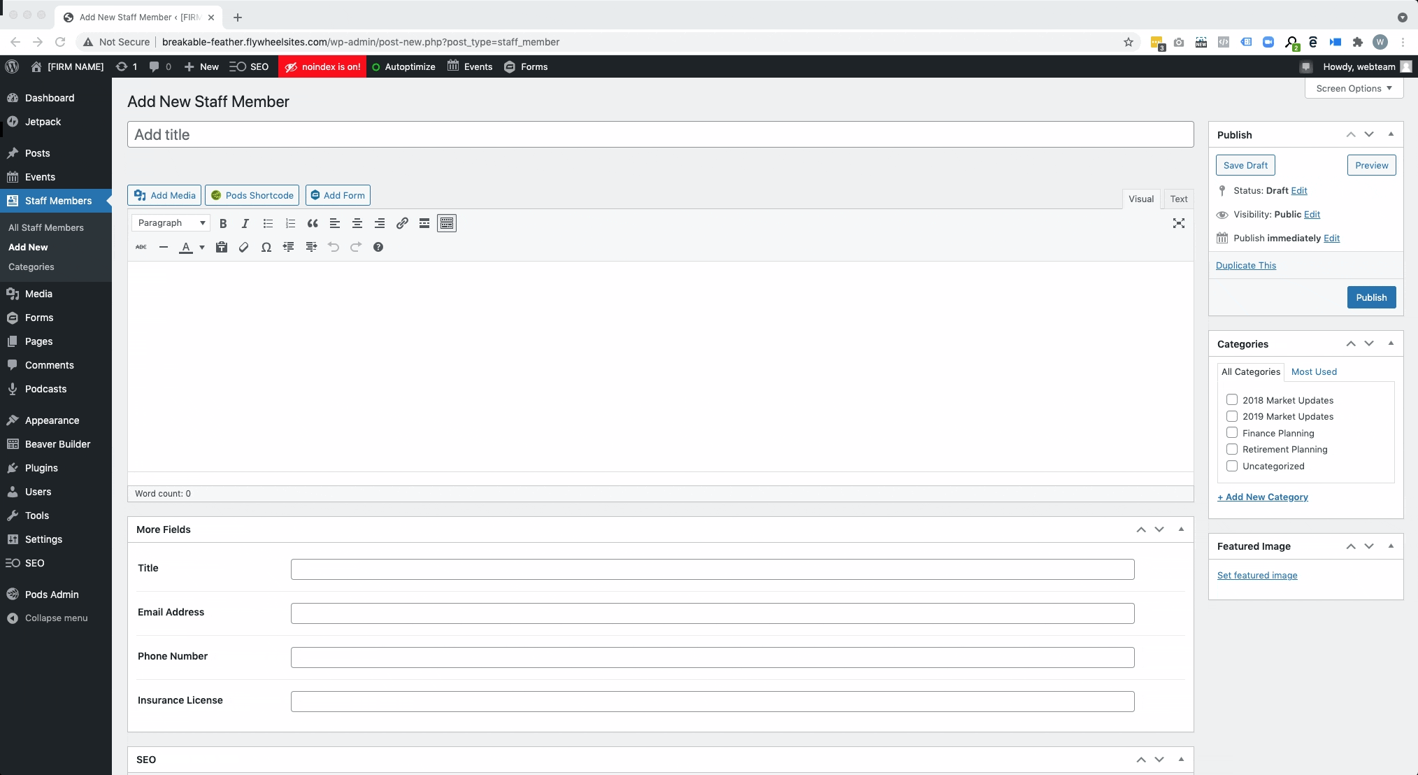 - Locate the “Staff Members” tab in the dashboard view of the site. You can either hover over “Staff Members” and click “Add New” to immediately open up a new staff member, or you can click on “Staff Memebers” which will take you to a listing of all staff.